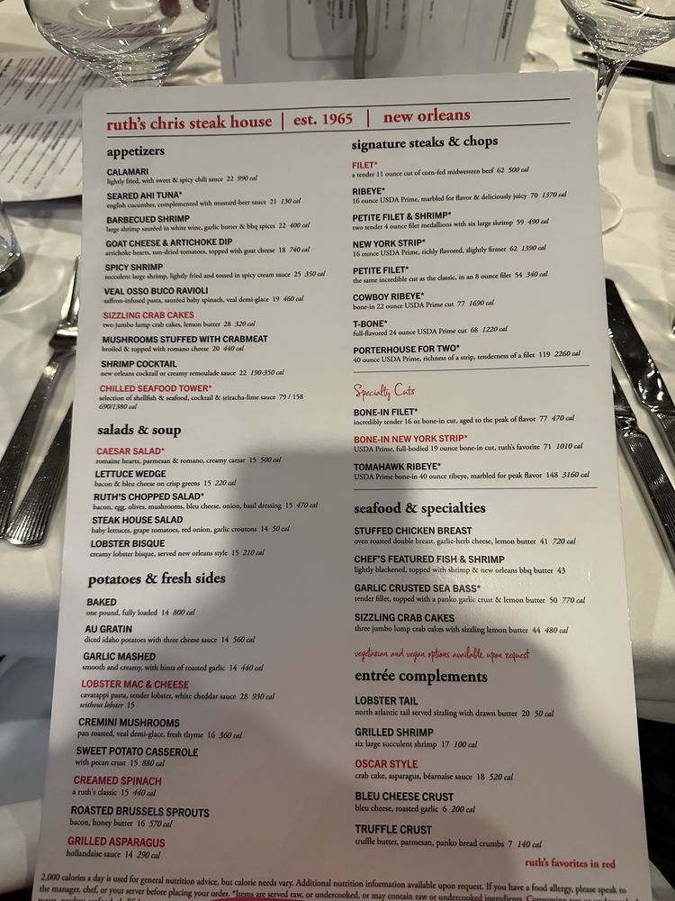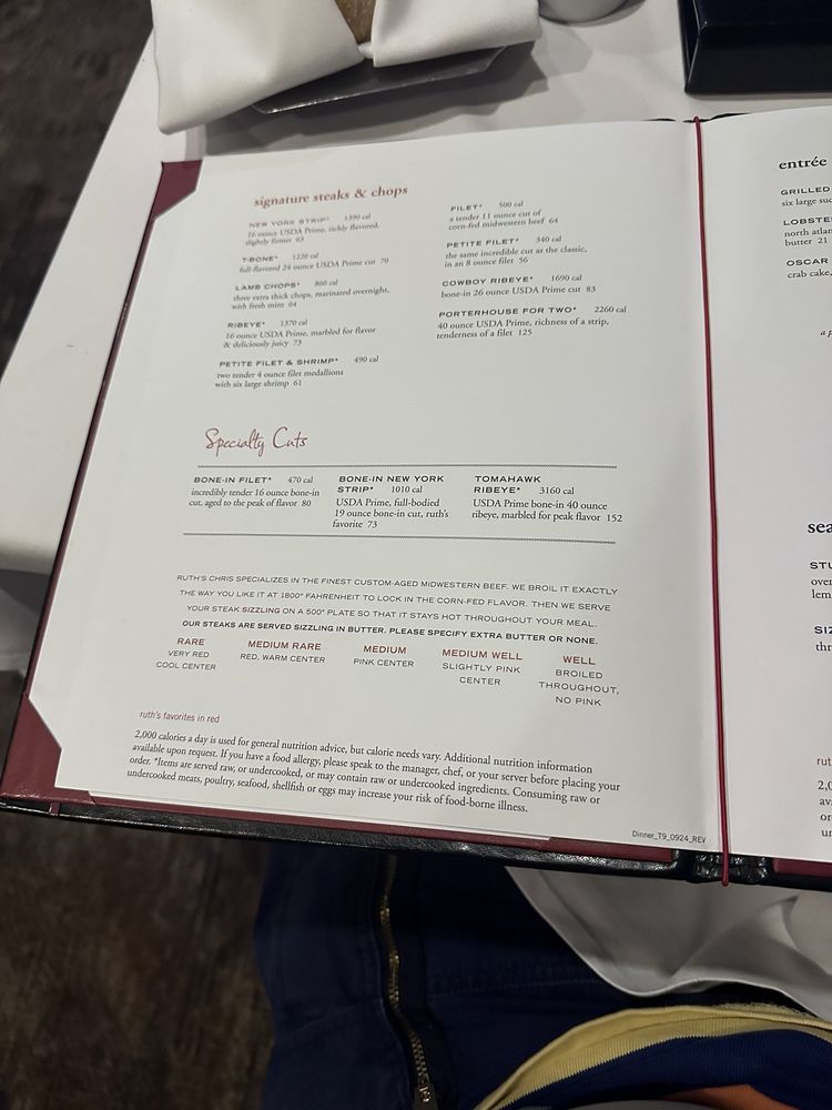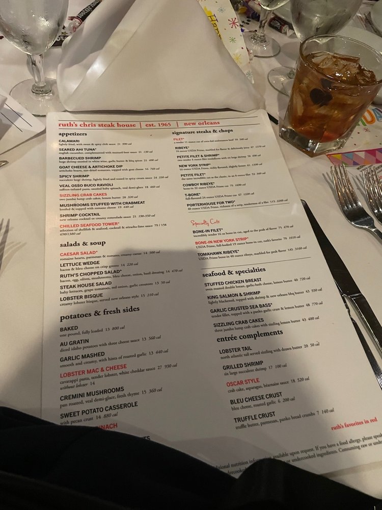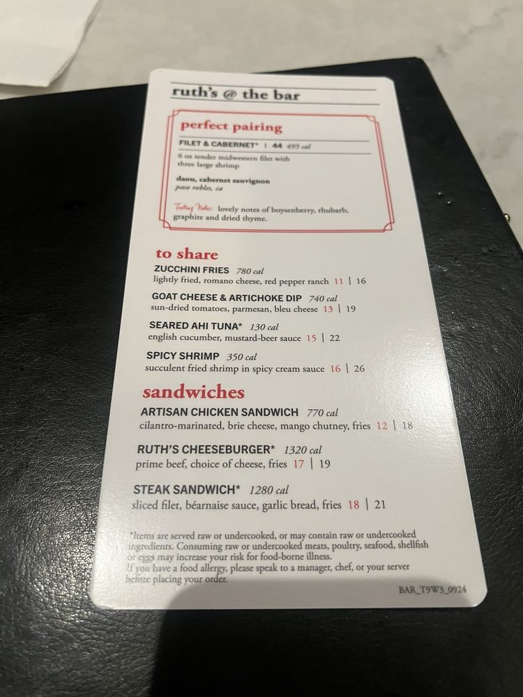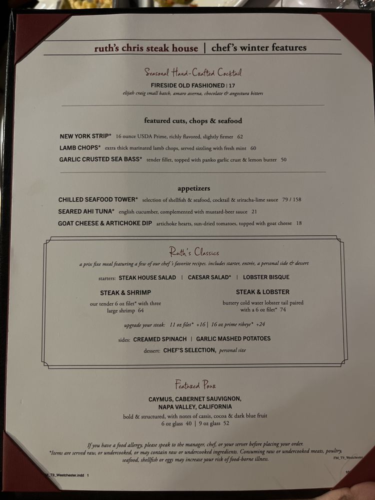 Introducing the menu at Ruth's Chris Steak House, located in Tarrytown, NY, you can expect a classy yet accessible dining experience. Specializing in steaks, seafood, and wine, this restaurant offers a range of options including keto, vegan, and vegetarian dishes. From appetizers like Barbecued Shrimp to succulent steaks like the Filet and Ribeye, there's something for everyone. The Caesar Salad, Ruth's Chopped Salad, and Steak House Salad provide fresh and flavorful options for soup and salad lovers. The cozy ambiance and attentive service make dining at Ruth's Chris a memorable experience. Customer reviews praise the perfectly cooked steaks, delicious sides like creamed spinach and garlic mashed potatoes, and the attentive staff. For a fine dining experience with a chill vibe, Ruth's Chris Steak House is a must-visit spot.